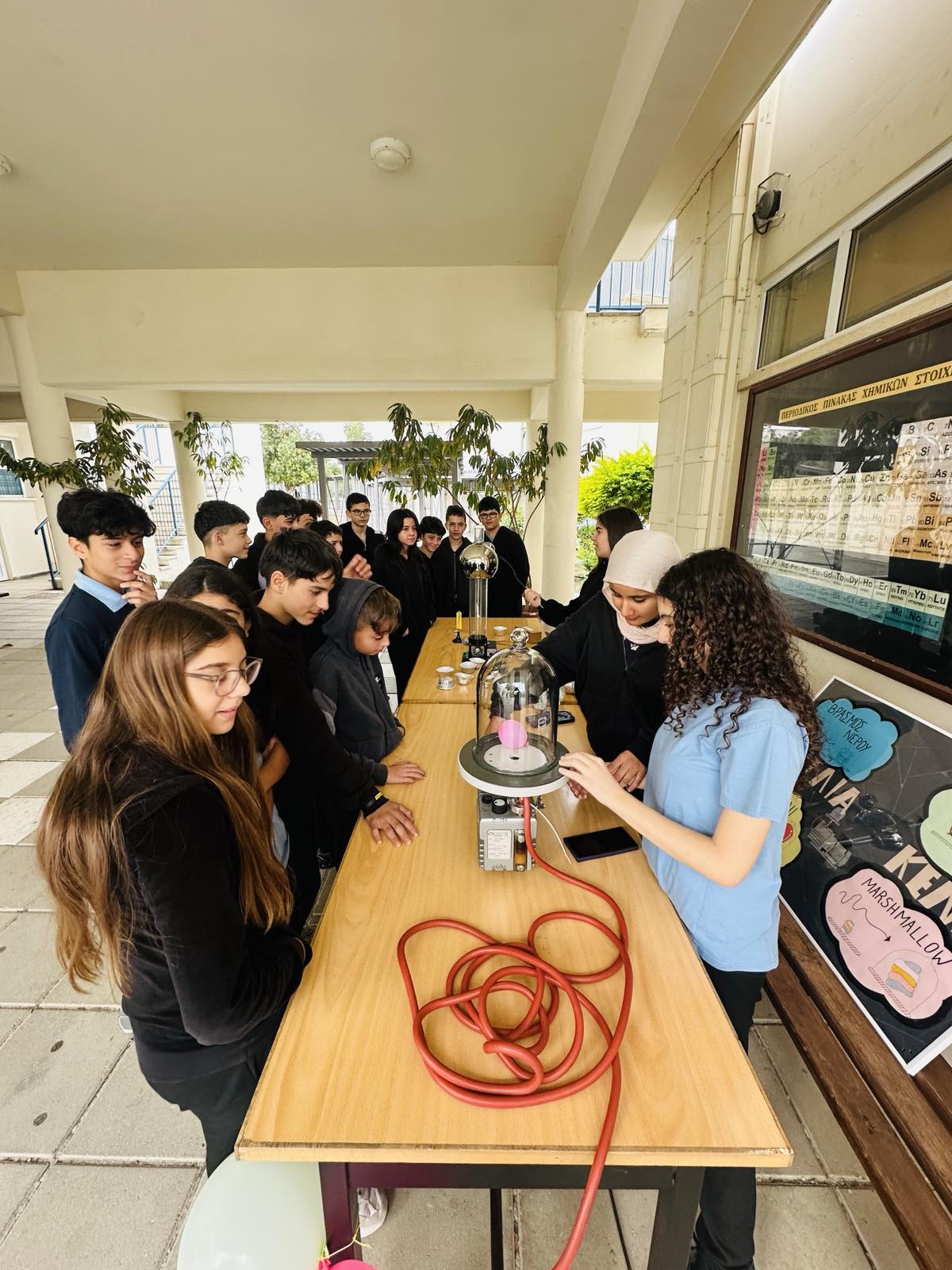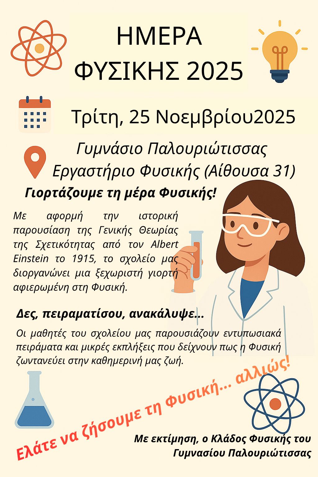 Ο Κλάδος Φυσικής του Σχολείου μας, με αφορμή την ιστορική παρουσίαση της Γενικής Θεωρίας της Σχετικότητας του Albert Einstein το 1915, διοργάνωσε μια ξεχωριστή γιορτή αφιερωμένη στην Ημέρα Φυσικής, στις 25 Νοεμβρίου. Οι μαθητές/τριες παρουσίασαν στους/στις συμμαθητές/τριές τους και στους/στις καθηγητές/τριες εντυπωσιακά πειράματα και μικρές εκπλήξεις, προσφέροντάς τους τη δυνατότητα να συμμετάσχουν ενεργά. Έτσι, επιβεβαίωσαν για άλλη μια φορά ότι η Φυσική αποτελεί αναπόσπαστο κομμάτι της καθημερινής μας ζωής.