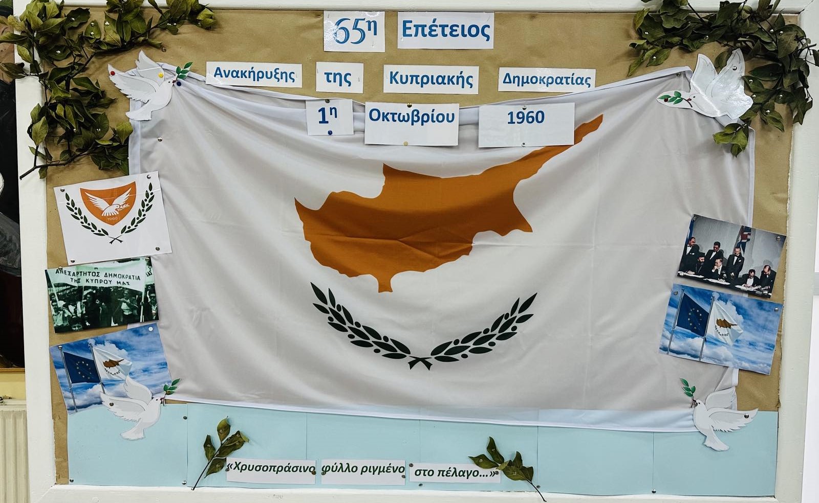 Την Τρίτη, 30 Σεπτεμβρίου 2025, πραγματοποιήθηκε στο Σχολείο μας ενδοτμηματική γιορτή για τα εξήντα πέντε χρόνια από την ανακήρυξη της Ανεξαρτησίας της Κυπριακής Δημοκρατίας, την 1η Οκτωβρίου 1960. Οι μαθητές/τριες παρακολούθησαν ένα βίντεο που παρουσίαζε τα σημαντικά γεγονότα και τους αγώνες που οδήγησαν στην ελευθερία της πατρίδας μας. Ακολούθησε τραγούδι αφιερωμένο στην Κύπρο και ο εορτασμός ολοκληρώθηκε με την ανάκρουση του Εθνικού Ύμνου, μέσα σε συγκινητική ατμόσφαιρα.