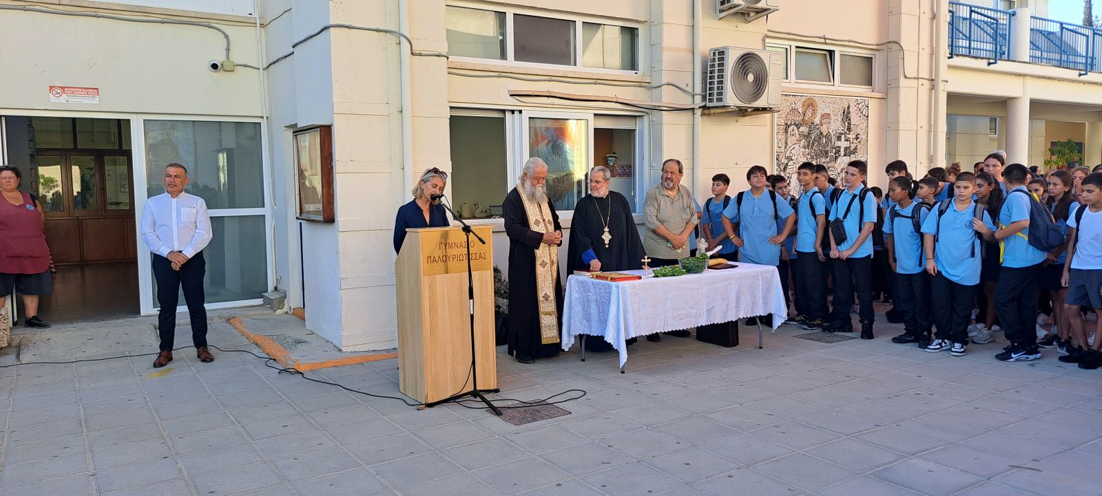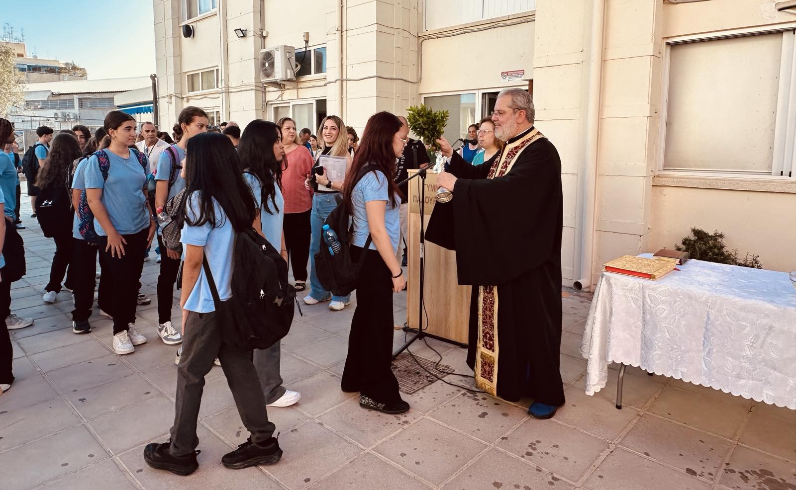 Την Παρασκευή, 5 Σεπτεμβρίου 2025, ήχησε το πρώτο κουδούνι της νέας σχολικής χρονιάς και το Σχολείο μας γέμισε με ευχάριστες φωνές και χαμόγελα. Οι μαθητές/τριες και οι εκπαιδευτικοί προσήλθαν στον χώρο συγκέντρωσης, όπου ο Διευθυντής του Σχολείου μας, Αρχιμανδρίτης Ιωάννης Ιωάννου, και ο εφημέριος του Ιερού Ναού Παναγίας Ευαγγελίστριας στην Παλουριώτισσα, Πρωτοπρεσβύτερος Μιχαήλ Μαλλιάπης, τέλεσαν τον καθιερωμένο αγιασμό. Στη συνέχεια, η Β.Δ.Α' κ. Ανθούλα Χατζηαντώνη διάβασε το μήνυμα του Αρχιεπισκόπου Κύπρου και η Β.Δ. κ. Ελίζα Καμπανελλά το μήνυμα της Υπουργού Παιδείας, Αθλητισμού και Νεολαίας. Ακολούθως, ο Διευθυντής καλωσόρισε τους μαθητές και τις μαθήτριες, εξέφρασε την επιθυμία του για μια αγαστή συνεργασία και ευχήθηκε σε όλους μια δημιουργική χρονιά, γεμάτη επιτυχίες και πρόοδο. Έπειτα, οι μαθητές/τριες οδηγήθηκαν στις τάξεις τους, όπου ενημερώθηκαν για τη λειτουργία και τους κανονισμούς τους σχολείου και παρέλαβαν τα βιβλία τους.