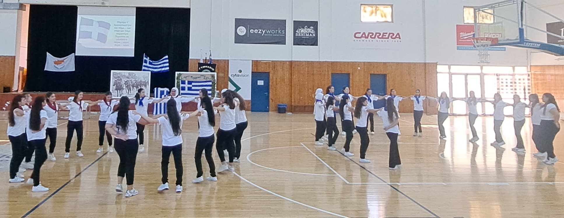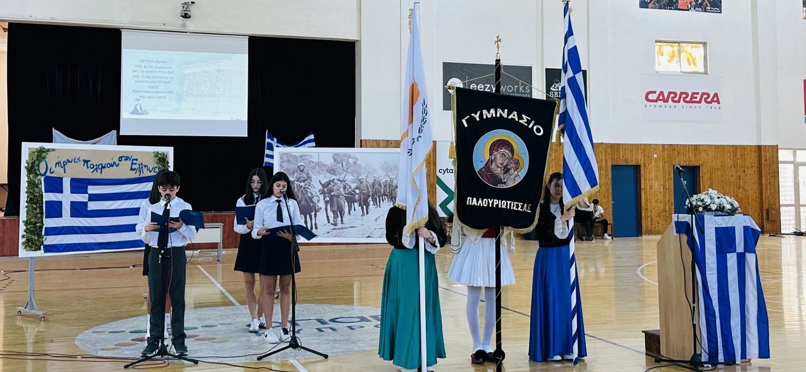 Στο πλαίσιο του ενδοσχολικού εορτασμού για τη Γιορτή της Σημαίας και την Εθνική Επέτειο της 28ης Οκτωβρίου 1940, το Σχολείο μας τίμησε με σεβασμό και περηφάνια τους αγώνες του ελληνικού λαού απέναντι στον φασισμό. Κατά τη διάρκεια της εκδήλωσης πραγματοποιήθηκε η ανακήρυξη των Σημαιοφόρων και Παραστατών του Σχολείου μας, καθώς και η παράδοση του Λαβάρου, της Ελληνικής και της Κυπριακής Σημαίας από τον Διευθυντή στους πρωτεύσαντες μαθητές κατά τη σχολική χρονιά 2024 - 2025. Ο εορτασμός περιλάμβανε συγκινητικά κείμενα, θεατρικό δρώμενο, πατριωτικά τραγούδια και χορούς, μέσα από τα οποία οι μαθητές και οι μαθήτριες απέδωσαν φόρο τιμής στους ήρωες του 1940 και ανέδειξαν το διαχρονικό μήνυμα του «ΟΧΙ» ως σύμβολο ελευθερίας, θάρρους και εθνικής αξιοπρέπειας.
